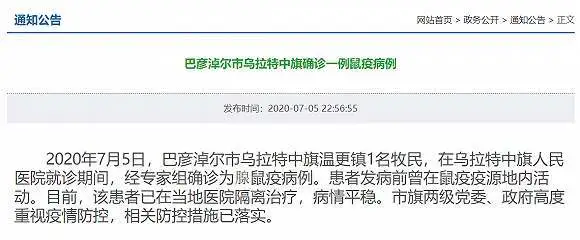 7月5日傍晚,內蒙古巴彥淖爾市衛(wèi)生健康委員會發(fā)布通告稱,烏拉特中旗人民醫(yī)院報告了1例疑似腺鼠疫病例,經研究決定,于7月5日發(fā)布鼠疫防控Ⅲ級預警。當天晚間,巴彥淖爾市衛(wèi)生健康委員會再次發(fā)布通告稱,該市烏拉特中旗確診一例鼠疫病例。