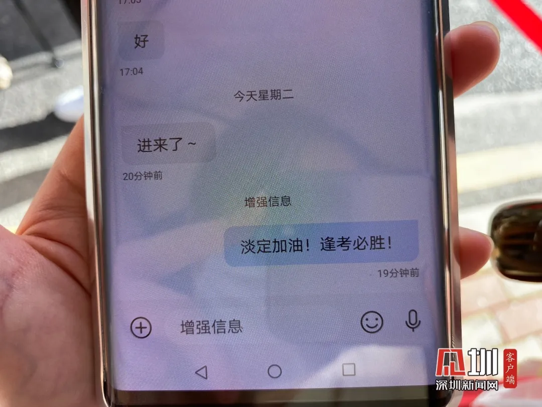 今早,在深圳中學送考現場,陳女士向記者展示給孩子發(fā)的高考加油短信:淡定,加油,逢考必勝。