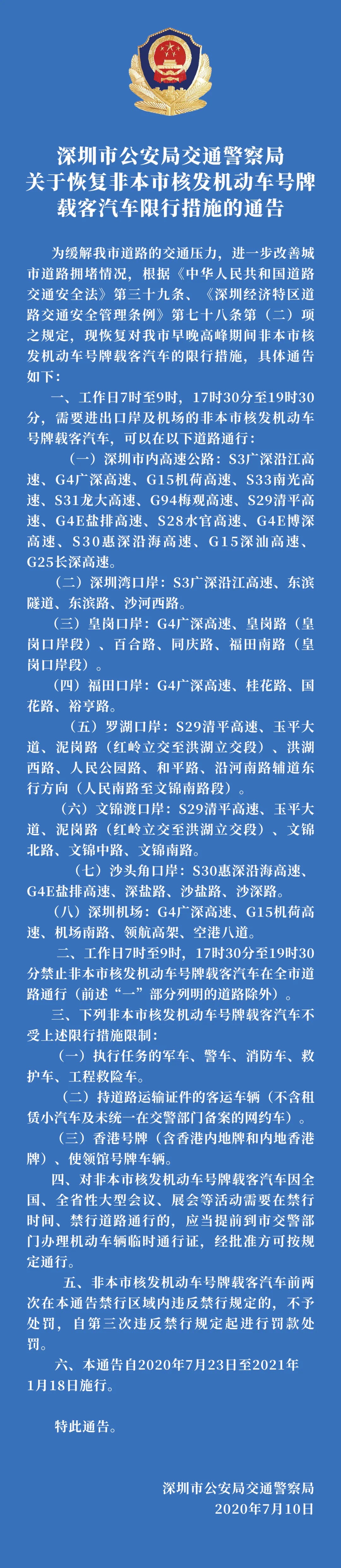 見圳客戶端?深圳新聞網(wǎng)2020年7月15日訊(見圳客戶端、深圳新聞網(wǎng)記者 張喆 陳彥如 實習生 廖章霖)7月15日,記者從深圳市交警支隊了解到,7月23日開始深圳將恢復“限外令”,對非深號牌小型載客汽車恢復限行。本次“限外令”與此前保持一致,除全市高速公路和部分疏港通道不限行以外,全市所有道路在早7:00-9:00和晚17:30-19:30高峰時段對所有非深圳號牌載客汽車實施限行。