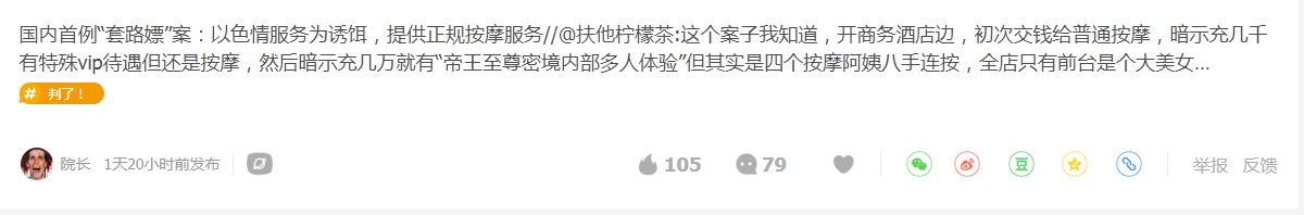 據(jù)報道,浙江一家SPA俊顏館初次交錢有普通按摩,暗示客戶充值有特殊服務,實際上是高級一點的按摩,再暗示充幾萬可享受“帝王至尊密境內(nèi)部多人體驗”,其實就是四個按摩阿姨八手連按。