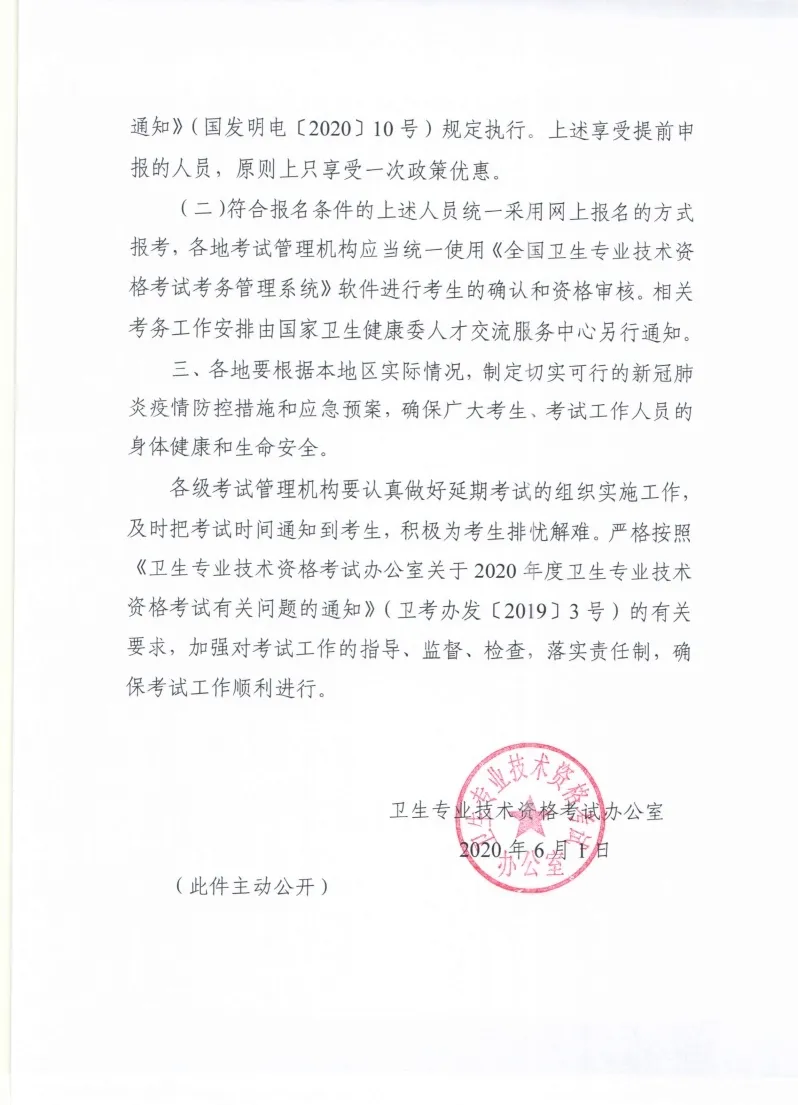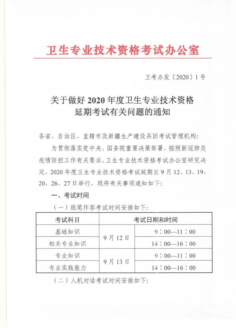 6月1日,衛(wèi)生專業(yè)技術(shù)資格考試辦公室印發(fā)《關(guān)于做好2020年度衛(wèi)生專業(yè)技術(shù)資格延期考試有關(guān)問(wèn)題的通知》,2020年度衛(wèi)生專業(yè)技術(shù)資格考試延期至9月12、13、19、20、26、27日舉行。