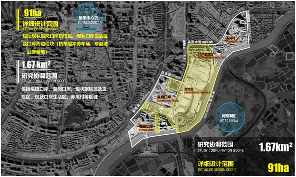 競(jìng)賽由深圳市投資控股有限公司主辦,深港科技創(chuàng)新合作區(qū)發(fā)展有限公司承辦,深圳市規(guī)劃和自然資源局、深圳市建筑工務(wù)署、福田區(qū)人民政府為技術(shù)指導(dǎo)單位,旨在落實(shí)關(guān)于皇崗口岸片區(qū)遴選國(guó)際一流設(shè)計(jì)師進(jìn)行整體設(shè)計(jì)、統(tǒng)一開(kāi)發(fā)、連片建造的要求,通過(guò)“定向邀請(qǐng)5家+資格預(yù)審10家”的方式,遴選了15家國(guó)際知名設(shè)計(jì)機(jī)構(gòu)參賽。其中,詳細(xì)設(shè)計(jì)范圍包括現(xiàn)狀皇崗口岸貨檢區(qū)、口岸生活區(qū)及口岸周邊地塊,面積約0.91平方公里;研究協(xié)調(diào)范圍為河套C區(qū),包括詳細(xì)設(shè)計(jì)范圍及周邊的福田口岸、赤尾村等區(qū)域,面積1.67平方公里。