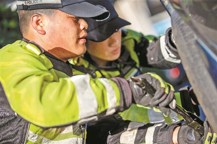 7月19日中午,時云財正在南山區(qū)同樂-茶光路口巡邏,看到路邊一位小車司機焦急地在車旁張望等待,時云財和同事林宇明、許爽一起趕過去詢問。原來,陳先生開車途中發(fā)現(xiàn)輪胎爆了,立即停到路邊,但是維修的車輛和人員許久未來,因為著急趕著去辦事,情緒有些焦慮。