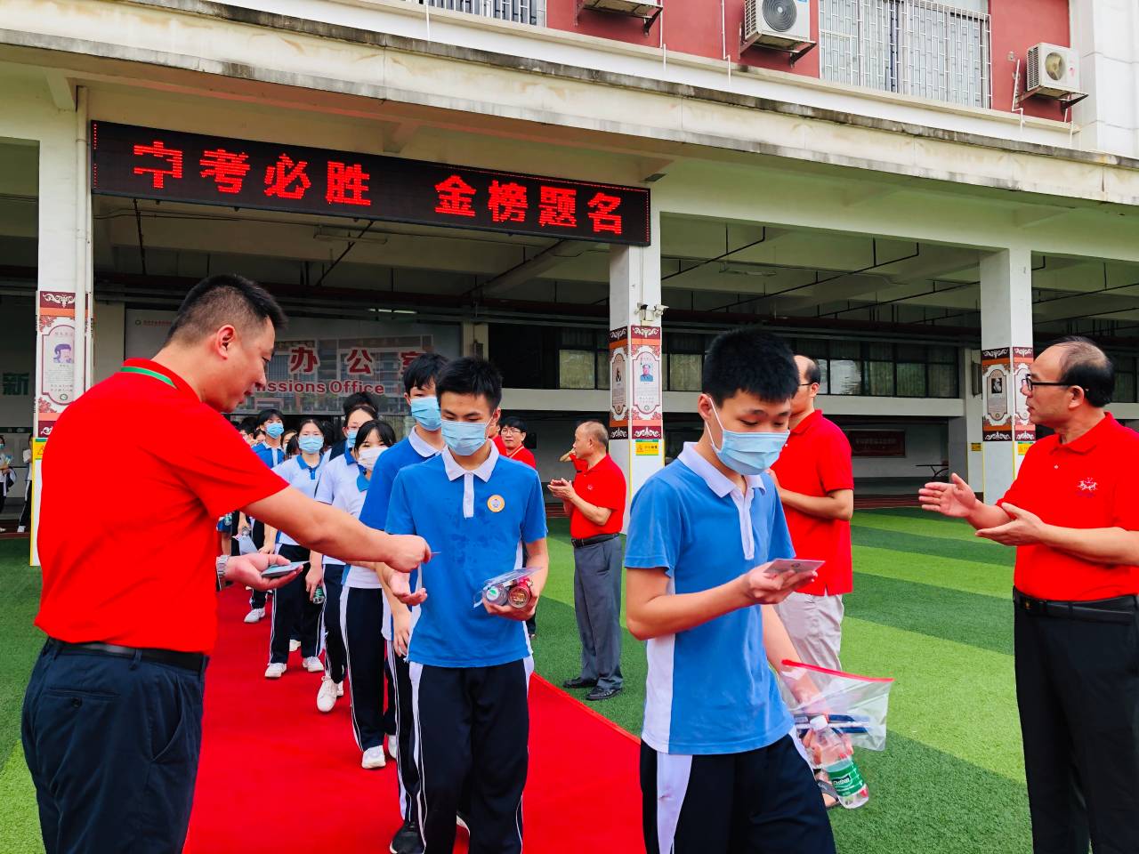 龍崗六約學校全體行政人員與九年級老師,穿著紅色送考服送考,寓意“鴻運當頭”。九年級學生走過龍門,踏上紅地毯,自帶炫酷出場bgm。(記者李麗、周紅聲)