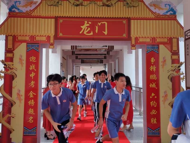 龍崗六約學(xué)校全體行政人員與九年級(jí)老師,穿著紅色送考服送考,寓意“鴻運(yùn)當(dāng)頭”。九年級(jí)學(xué)生走過(guò)龍門,踏上紅地毯,自帶炫酷出場(chǎng)bgm。(記者李麗、周紅聲)