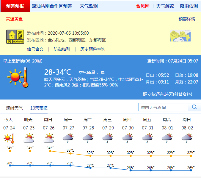 見圳客戶端·深圳新聞網(wǎng)2020年7月24日訊(見圳客戶端、深圳新聞網(wǎng)記者 陳婕 鄭曉鵬)老天熱“晴”不斷,今明兩天悶熱加劇。24日晴天間多云,天氣悶熱;氣溫28-34℃,中北部再高1-2℃;偏南風(fēng)3級;濕度55%-90%。25日晴天間多云,最高氣溫34-35℃,中北部可達(dá)36-37℃。26日持續(xù)晴熱,局地有短時(雷)陣雨;27-29日多云,有短時(雷)陣雨;30日有陣雨或雷陣雨。