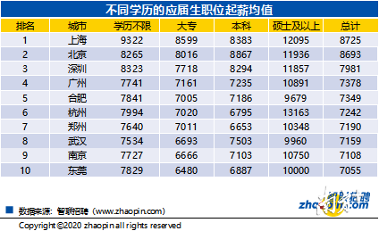 上海、北京、深圳、廣州這些一線城市的應屆生平均起薪相對較高。一般而言,在各城市中,隨著學歷的提高,應屆生起薪也會相應增加。但由于職業(yè)或行業(yè)的人才缺口較大,使得某些職位盡管學歷不限或僅要求大專學歷,但其薪酬卻相對較高。例如,上海有的職位學歷不限或要求大專以上,但起薪要高于本科崗位,這也間接反映出應屆生就業(yè)市場存在明顯的結構矛盾。