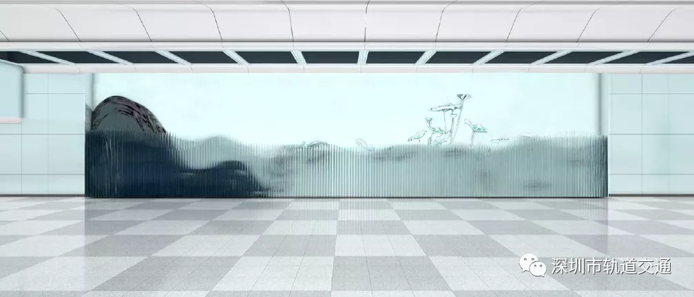 該站的文化藝術(shù)墻采用鋼化玻璃和不銹鋼噴漆,通過(guò)材質(zhì)的特性,呈現(xiàn)出自然變化的形態(tài),不同環(huán)境下不同的形態(tài)美。