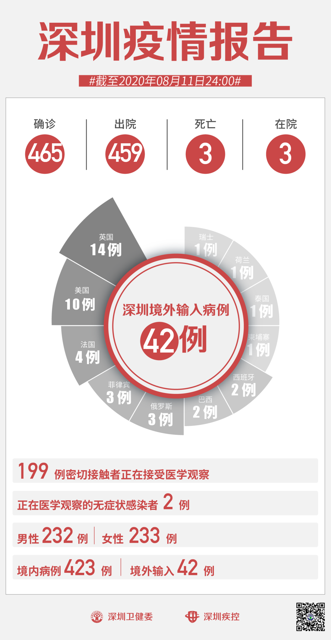 截至8月11日24時,深圳市累計報告新冠肺炎確診病例465例。目前在院3例。