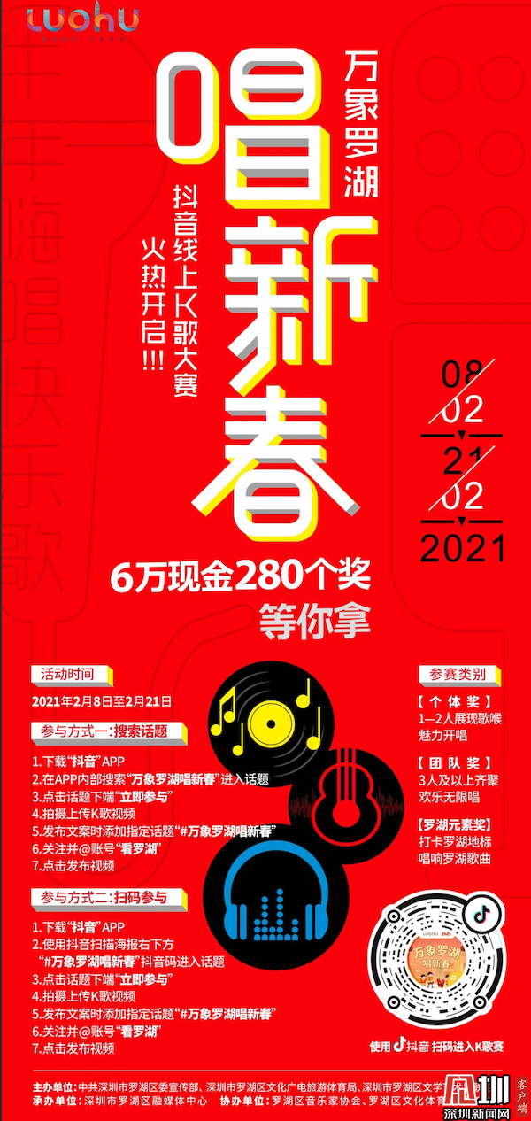同時(shí),羅湖區(qū)還推出了趣味十足的“萬象羅湖唱新春”抖音線上k歌大賽,營(yíng)造全民k歌迎新春的熱潮。唱你心中想唱的歌曲,歌曲形式、曲目不限,只要內(nèi)容積極向上,且充滿正能量即可。此次比賽共設(shè)6萬元現(xiàn)金280個(gè)獎(jiǎng),最高可獲得2888元現(xiàn)金!