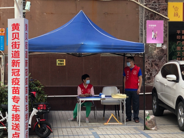 炎炎烈日,為貼心服務群眾,黃貝街道設立了接種新冠疫苗專車接送點。接送點的義工告訴記者,在戶外工作特別消耗水,一個上午就喝掉四五瓶飲用水,雖然準備了防曬的雨棚,但路上的熱空氣卻躲不掉,一會兒下來也是大汗淋漓,不過能為群眾服務,盡快建立全民免疫陣線,這份守候很值得。