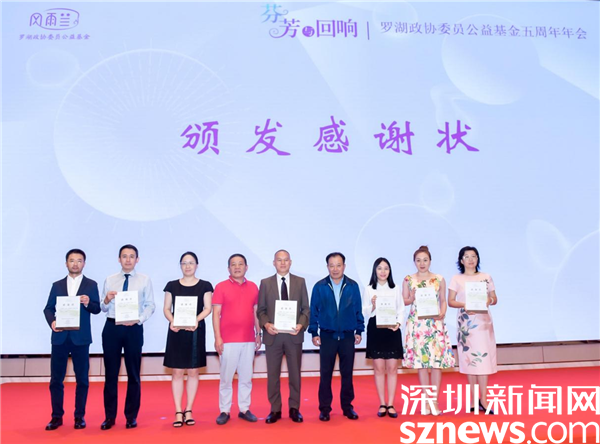 活動最后,與會領(lǐng)導(dǎo)向深圳壹基金公益基金會、羅湖社會創(chuàng)新空間和區(qū)政協(xié)歷屆港澳委員聯(lián)誼會等10個相關(guān)友好單位和個人頒發(fā)了感謝狀;向熱心社會公益、積極捐助善款的19名政協(xié)委員代表頒發(fā)慈善獎。
