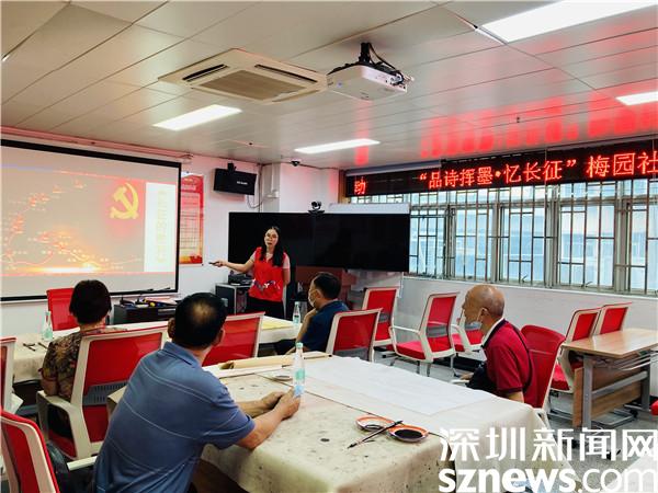 讀特客戶端·深圳新聞網(wǎng)2021年9月9日訊(記者 郭含笑 通訊員 梁嘉麗/文 張亮亮/圖)今年是中國共產(chǎn)黨成立100周年,在第二十二屆深圳讀書月來臨之際,9月9日下午,深圳市羅湖區(qū)清水河街道梅園社區(qū)黨委聯(lián)合梅園社區(qū)婦聯(lián)、梅園社區(qū)長青老齡大學(xué)、深圳市東西方社工服務(wù)社駐梅園社區(qū)黨群服務(wù)中心社工,在紅崗大廈二樓多功能室開展“品詩揮墨?憶長征”讀書月活動。