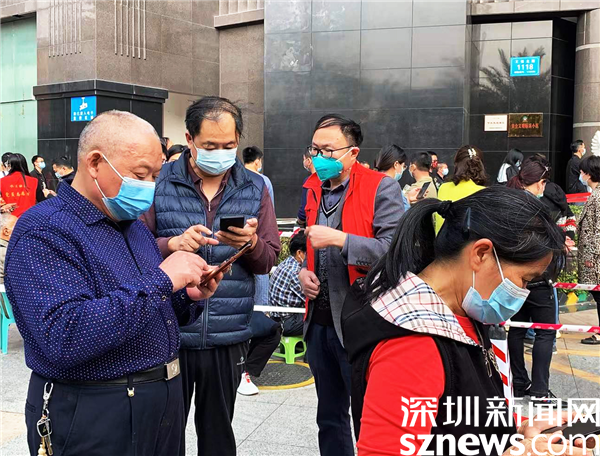 羅湖區(qū)審計局副局長陳偉健在水貝社區(qū)防疫現(xiàn)場指導(dǎo)使用“i深圳”。