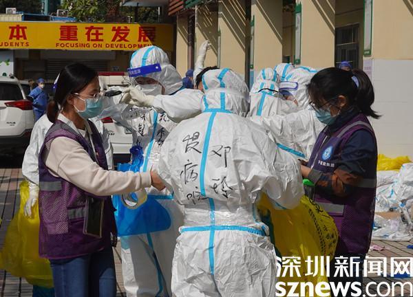 臘八節(jié)剛過,深圳帶著些許涼意,卻也是艷陽高照?!巴緜儯嗷z查一下手腕腳腕有沒有貼好!穿戴整齊后準備集結(jié)出發(fā)啦!”在封控區(qū)外圍的醫(yī)護人員整備區(qū),一群身穿防護服、全副“武”裝的工作人員整裝待發(fā),兩人一組,目光堅定,向著封控區(qū)的入口走去。