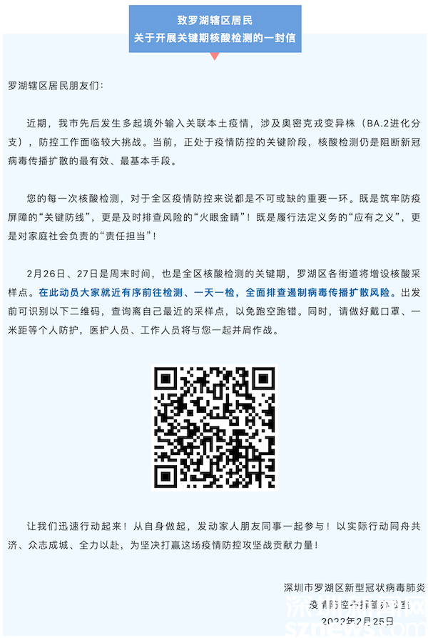 讀特客戶端·深圳新聞網(wǎng)2022年2月26日訊(記者 覃鈺清)2月25日晚,羅湖區(qū)新型冠狀病毒肺炎疫情防控指揮部辦公室發(fā)出《致羅湖轄區(qū)居民關(guān)于開展關(guān)鍵期核酸檢測的一封信》,該信函指出,本周末(2月26日、27日)是全區(qū)核酸檢測的關(guān)鍵期,全區(qū)各街道共設(shè)置200個(gè)核酸采樣點(diǎn),動(dòng)員轄區(qū)所有居民就近有序前往檢測、一天一檢,全面排查遏制病毒傳播擴(kuò)散風(fēng)險(xiǎn)。26日上午,記者前往羅湖區(qū)桂園街道實(shí)地探訪核酸檢測開展情況。
