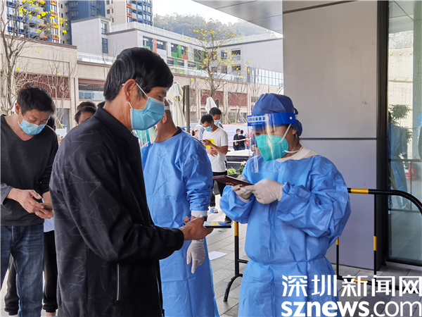 社工在核酸檢測(cè)點(diǎn)進(jìn)行核酸檢測(cè)掃碼服務(wù)。