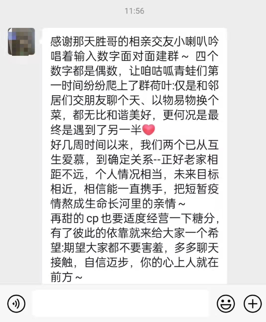 讀特客戶端·深圳新聞網(wǎng)2022年3月22日訊(記者 梁榆其 馮牧原 見習記者 林楚楚)前段時間,一段防疫人員手持喇叭播放面對面組建單身交友群的視頻火遍全網(wǎng)。3月22日,群主王勝告訴記者,目前在組建的10個隔離不隔愛單身群中已成功誕生了5對情侶。