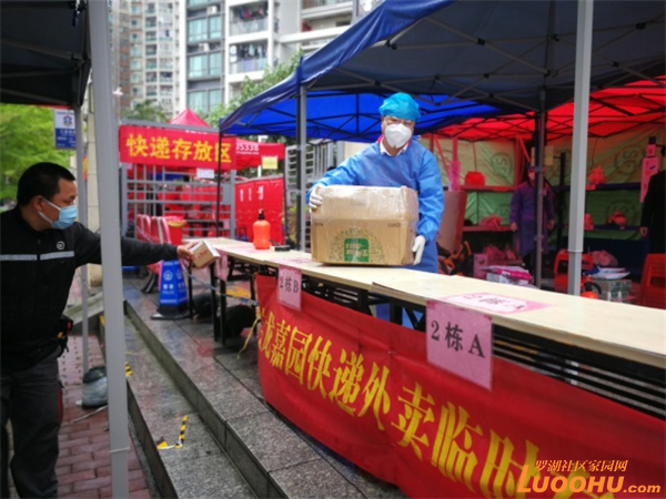 隨著快遞和線上訂菜數(shù)量增多,為了避免居民取快遞聚集以及與快遞員頻繁接觸,寶龍管理嘉園管理處決定在小區(qū)正門設(shè)立快遞外賣臨時存放點,根據(jù)樓棟、物品類型等進行分類,實行“無接觸”配送。存放點麻雀雖小,但五臟俱全:分別設(shè)有快遞消毒分揀區(qū)、郵寄快遞消毒交接區(qū)、消毒分類中轉(zhuǎn)區(qū)、快遞存放區(qū)、外賣(生鮮蔬菜快餐)存放區(qū)。