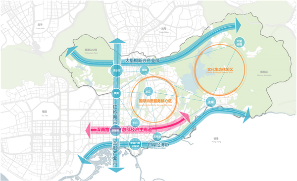 “一主”是以深南東路為中軸線,高起點(diǎn)打造總部經(jīng)濟(jì)主廊道?!皟蓞^(qū)”是高品質(zhì)建設(shè)國(guó)際消費(fèi)服務(wù)核心區(qū)和文化生態(tài)休閑區(qū)。“三帶”是高能級(jí)規(guī)劃深港口岸經(jīng)濟(jì)帶、紅嶺新興金融產(chǎn)業(yè)帶和大梧桐新興產(chǎn)業(yè)帶。