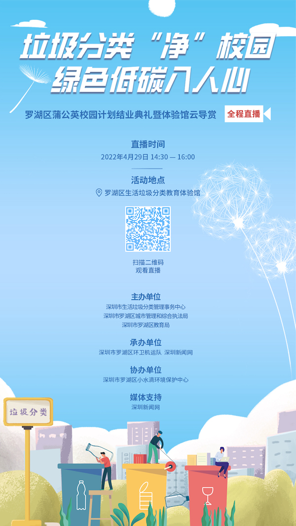 4月29日下午2:30—4:00,羅湖區(qū)首期蒲公英教師培訓(xùn)迎來結(jié)業(yè),羅湖區(qū)垃圾分類體驗館館經(jīng)歷多月重整布展后煥新重開,屆時,深圳市生活垃圾分類管理事務(wù)中心、羅湖區(qū)城市管理和綜合執(zhí)法局和羅湖區(qū)教育局共同舉辦垃圾分類“凈”校園綠色低碳入人心——羅湖區(qū)蒲公英校園計劃結(jié)業(yè)典禮暨科普館云導(dǎo)賞活動,深圳新聞網(wǎng)將進(jìn)行全程直播,歡迎各位網(wǎng)友觀看。