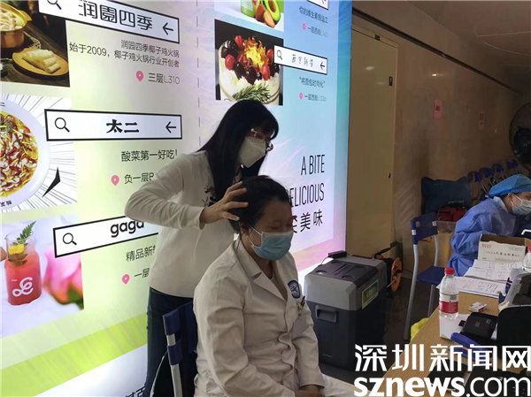 5月1日下午,老圍社區(qū)黨委書記許少瓊來到KKMALL商場負一樓的疫苗接種點,看望現(xiàn)場的工作人員和醫(yī)務人員,檢查當天的疫苗接種情況,并與工作人員一起動員來往行人進行加強針的接種。當她聽說負責登記的醫(yī)生因為淋雨著涼而頭疼得厲害,卻還在默默堅持時,許少瓊立刻走到醫(yī)生的身后,為醫(yī)生按摩頭部。被按摩的醫(yī)生一再說,“很舒服,輕松了很多?!逼鋵崳@一天,連續(xù)工作4個月無休的許少瓊,身體也不是很好,但她用堅強的毅力壓抑了身體的不適,以一貫的積極樂觀影響帶動著身邊的同事。
