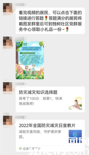 疫情防控期間,不宜開展人群聚集活動,但事關(guān)社區(qū)居民的公益講座卻不能停滯。對此,獨樹社區(qū)創(chuàng)新開展“云課堂”,通過線上視頻課程講解、線上互動、有獎競答等多種形式開展,讓居民群眾足不出戶就能學(xué)習(xí)防災(zāi)減災(zāi)相關(guān)知識。