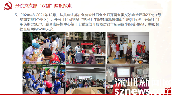 區(qū)中醫(yī)院康復(fù)分院黨支部以黨建引領(lǐng)“雙創(chuàng)”工作取得良好實(shí)效,與黃貝社區(qū)黨委的共建和交叉任職推動醫(yī)療資源和社區(qū)服務(wù)的資源共享,把“社區(qū)關(guān)愛服務(wù)”落到實(shí)處。通過黨組織聯(lián)動,增強(qiáng)了居民與醫(yī)護(hù)之間的溝通聯(lián)系,有力推動65歲老人體檢和疫苗接種,大大提升居民認(rèn)可度、滿意度??祻?fù)分院黨支部與社區(qū)黨支部和黨員義工合作,為轄區(qū)內(nèi)70歲以上生活不便孤寡老人提供全方位的關(guān)愛服務(wù),開展上門訪視服務(wù)535人次;深入各小區(qū)開展各類義診宣傳、健康知識推廣活動等36場,惠及居民5000余人。