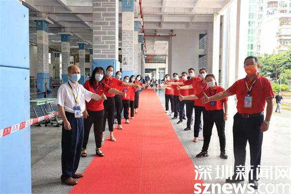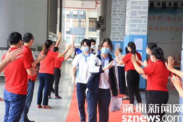 除了家長(zhǎng)的花式祝福外,老師們的加油行動(dòng)也是一道亮眼風(fēng)景線。羅湖翠園中學(xué)校長(zhǎng),高三年級(jí)主任身穿紅色送考服為考生加油。深圳市第一職業(yè)技術(shù)學(xué)校校領(lǐng)導(dǎo)和老師們?cè)诳忌亟?jīng)考場(chǎng)的路上,站成兩列縱隊(duì)等待著考生,當(dāng)考生經(jīng)過(guò)時(shí),老師們伸出手與考生擊掌,為考生加油。