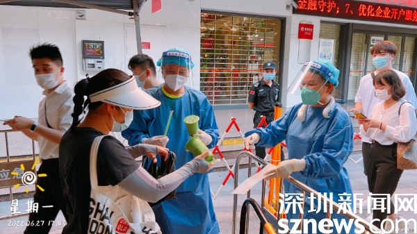 除了“人力”支援,“物力”支援也沒落下??紤]到大部分核酸檢測點的現(xiàn)場工作人員要在高溫下工作,南湖街道周邊商戶及居民自發(fā)送來米湯、甘蔗汁等防暑物資,為防疫一線工作人員“送清涼”。