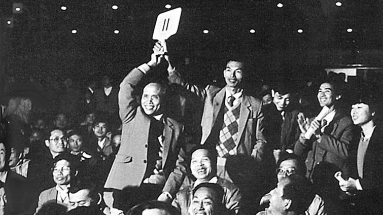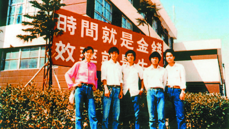 20世紀(jì)80年代初,蛇口青年工在標(biāo)語(yǔ)牌下留影