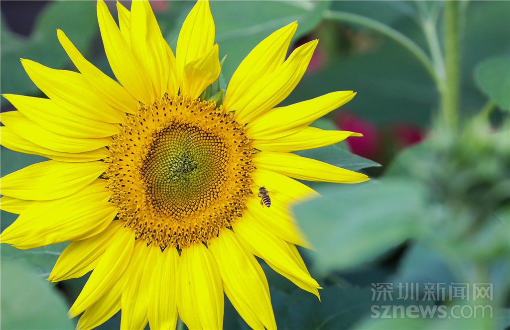 勤勞的蜜蜂腳上包裹著采集的花粉準(zhǔn)備離去