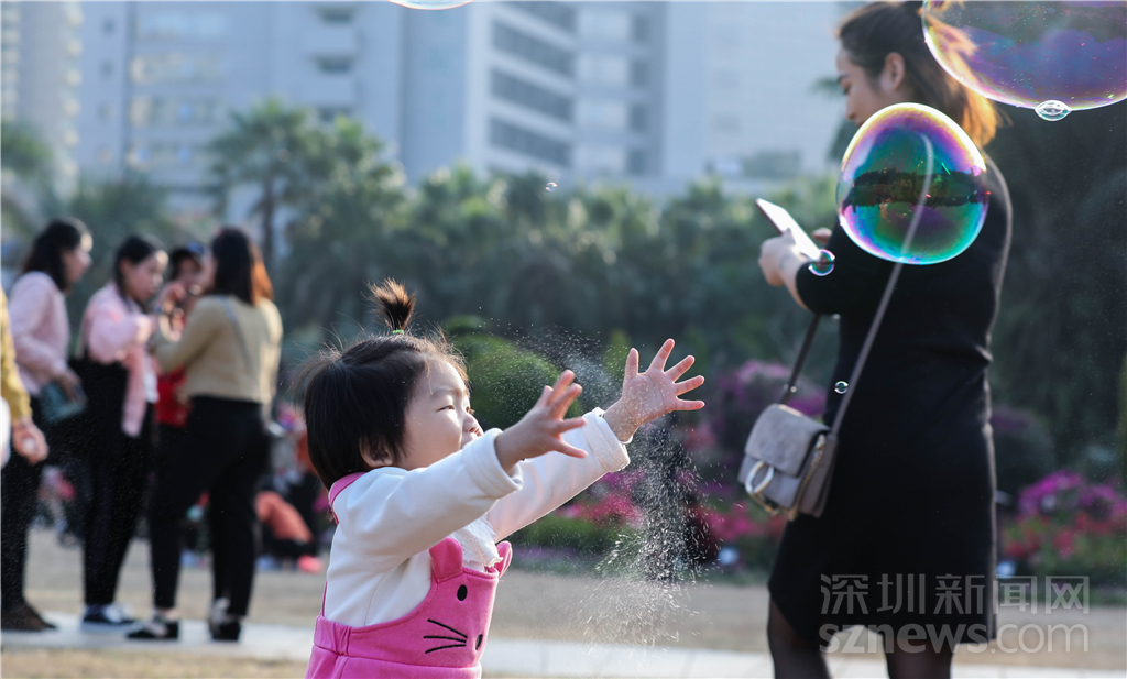 孩子在廣場(chǎng)上追著泡泡開(kāi)心地玩耍著