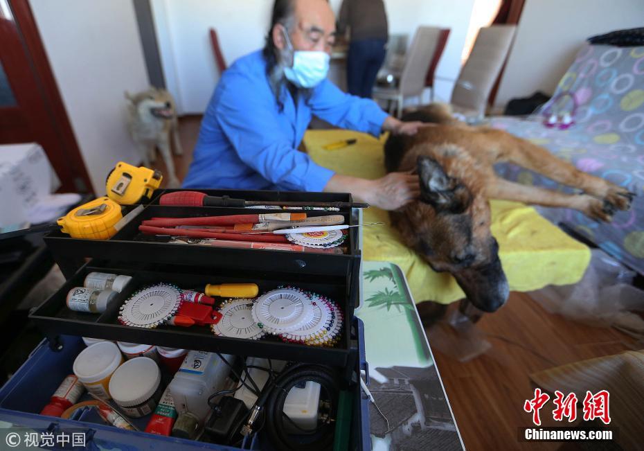 2018年春節(jié)期間,前往北京市朝陽區(qū)高碑店鄉(xiāng)大黃莊社區(qū)甲3號的人絡(luò)繹不絕,他們來這里的目的,就是為了讓自己的愛犬“重生”。這家店的主人名叫老郭,是一位動(dòng)物標(biāo)本制作師,他對來客常說的一句話就是:“你帶著躺下了的寵物來,我還你一個(gè)站起來的它”。圖為郭元虎正在制作狗標(biāo)本。文字來源:法制晚報(bào) 圖片來源:視覺中國