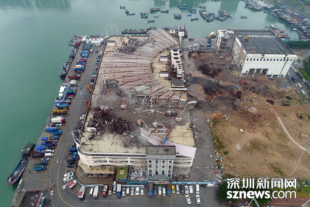 漁人碼頭拆除現(xiàn)場,原漁人碼頭水產(chǎn)交易市場的頂層已快拆除過半