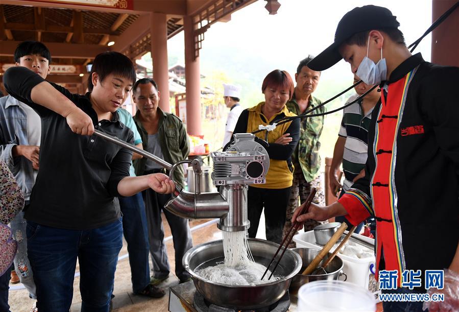 4月19日,在廣西南寧市青秀區(qū)南陽(yáng)鎮(zhèn)施厚村古岳坡,游客在觀看米粉制作。今年“壯族三月三”假期期間,不少市民游客前往鄉(xiāng)村旅游觀光,激發(fā)了一股鄉(xiāng)村旅游小熱潮。“壯族三月三”是廣西壯族自治區(qū)確定的法定假期。新華社記者陸波岸 攝