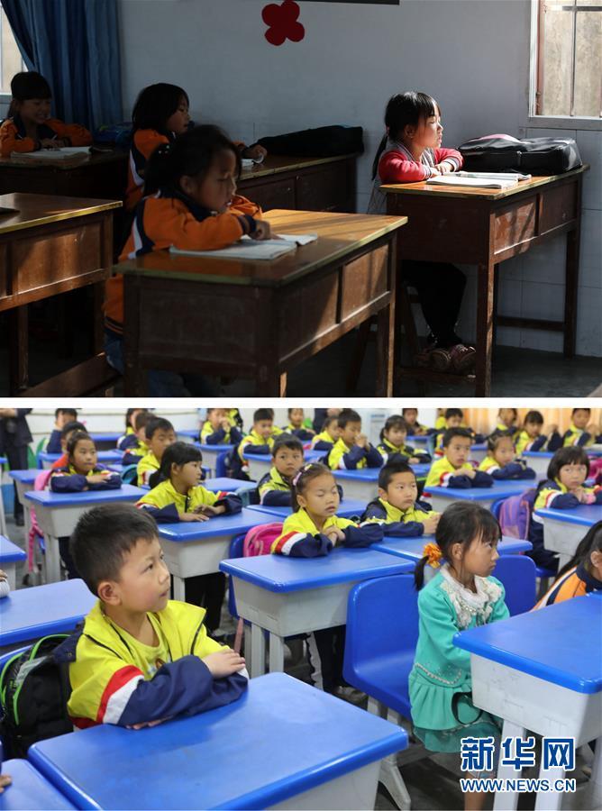 拼版照片:上圖為7歲的李曉彤(右一)在華山小學教室內晨讀(4月27日攝);下圖為7歲的李曉彤(前排左二)在黔西縣第十小學教室內上課(5月7日攝)。貴州省黔西縣金蘭鎮(zhèn)瓦房村哈沖組位于六沖河岸邊的崖壁下,哈沖組的孩子們每天要往返崖壁上的山路才能到達華山小學就讀。28年來,崖壁上約4公里山路成了當?shù)孛缱鍖W生艱難危險的求學路。 5月5日起,哈沖組里的苗族同胞陸續(xù)通過易地扶貧搬遷至縣城的錦繡花都安置點,孩子們也陸續(xù)搬至黔西縣第十小學就讀。自此,孩子們的上學路從約2個小時艱難跋涉的崖壁山路變?yōu)椴叫兄恍枰胄r的公路。求學之路“天塹變通途”,哈沖組村民幾代人的崖壁求學路成為歷史。新華社記者歐東衢攝