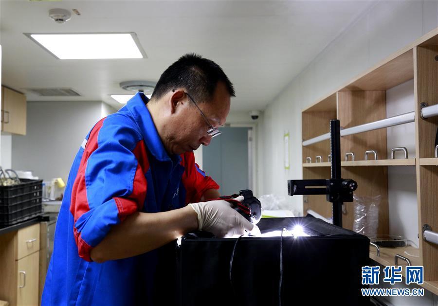 中國科學院海洋研究所李新正研究員在“探索一號”科考船上拍攝樣品(5月19日攝)。新華社記者 張建松 攝