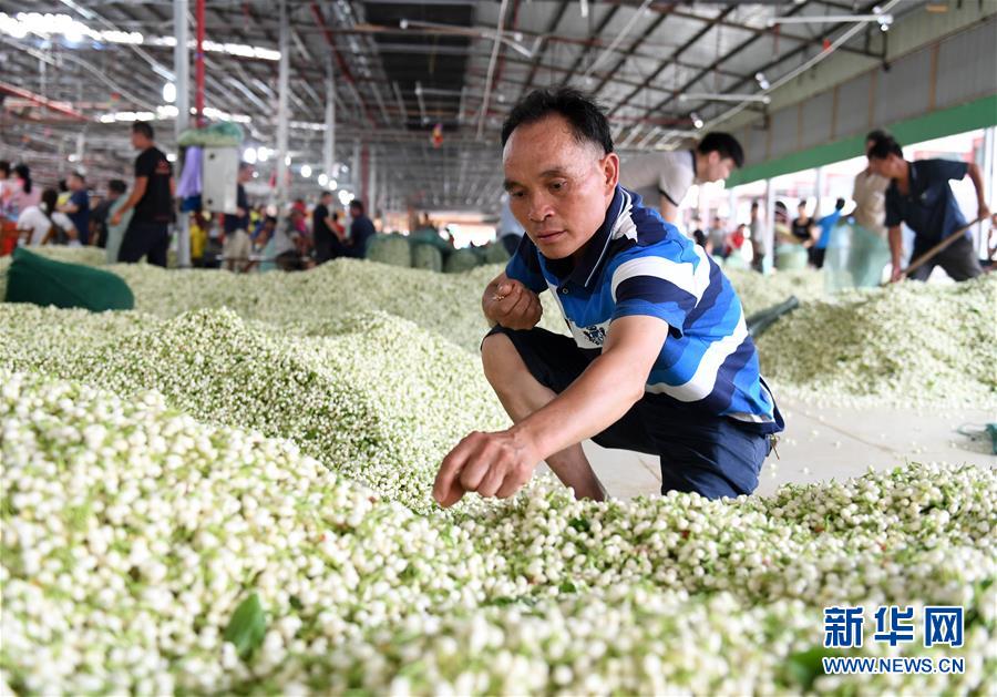 6月20日,在廣西橫縣茉莉花市場(chǎng),一名男子撿茉莉花堆里的雜物。