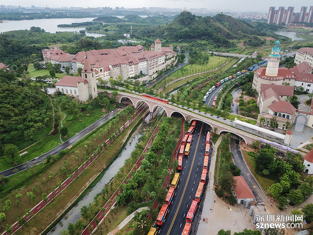 專為家住深圳的員工準備的通勤大巴整齊停在道路兩側