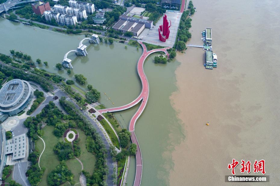 7月10日,航拍長江與南京秦淮河交匯處,江水與河水“涇渭分明”。當(dāng)日,江蘇水利廳發(fā)布的水情信息顯示,長江南京段水位已降至警戒線以下。中新社記者泱波 攝