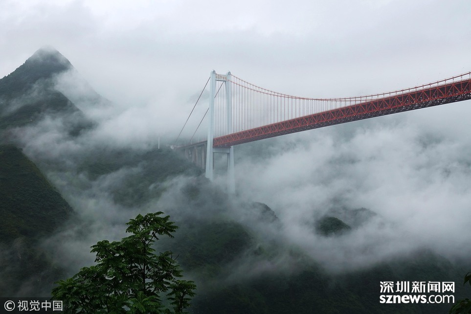 2018年6月26日,一場大雨后貴州省安順市關嶺縣壩陵河大峽谷云霧繚繞,橫跨兩岸的壩陵河大橋在云霧中時隱時現(xiàn),更顯雄偉壯觀。