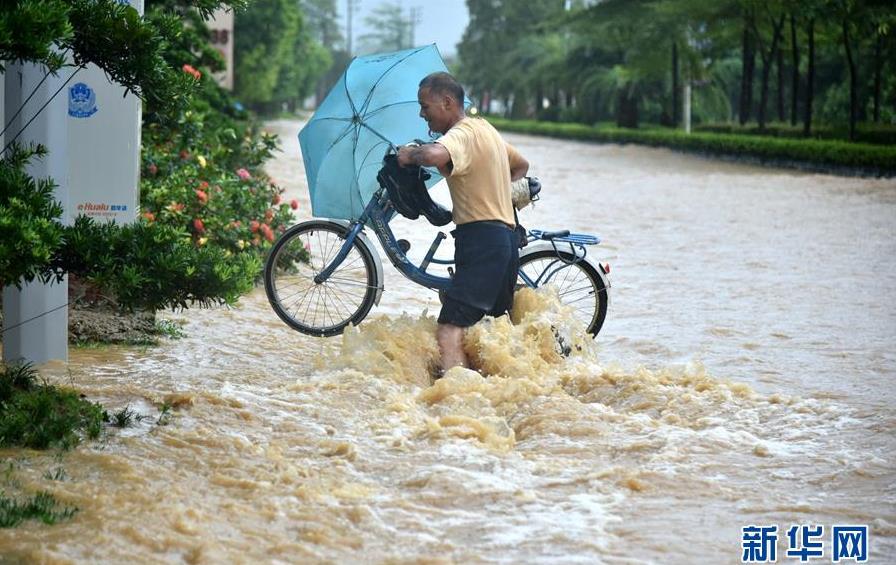 9月17日,陽春市一位市民在積水嚴重的街道上騎行。 當日,今年第22號臺風“山竹”過境后的廣東陽江陽春市遭遇暴雨襲擊,城市部分區(qū)域出現(xiàn)內(nèi)澇。 新華社記者周科攝