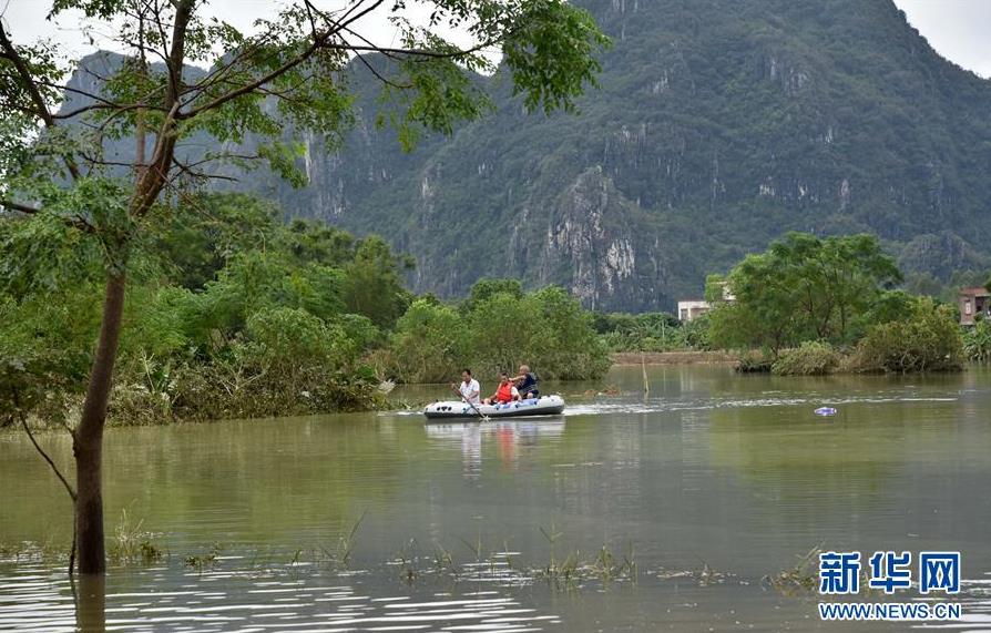 9月18日,廣東省陽江市陽春市陂面鎮(zhèn)政府工作人員在潭潦村被淹的農(nóng)田上查看水情。