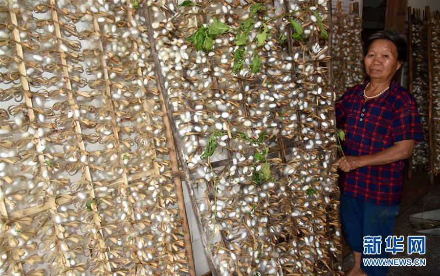 9月18日,在廣東省陽(yáng)江市陽(yáng)春市陂面鎮(zhèn),村民謝芳英在收拾從水中撈上來(lái)的蠶繭。 新華社記者 周科 攝