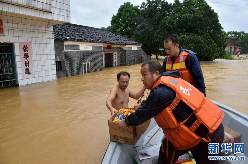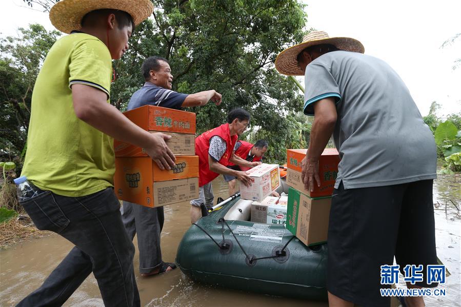 9月18日,在廣東省陽(yáng)江市陽(yáng)春市,人們把食物搬運(yùn)到筏子上,準(zhǔn)備分發(fā)給受困村民。 新華社記者張加揚(yáng)攝