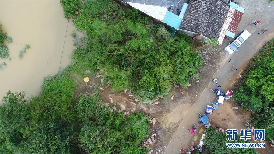 9月18日,在廣東省陽(yáng)江市陽(yáng)春市,村民將家畜轉(zhuǎn)移到高處(無(wú)人機(jī)拍攝)。 新華社記者張加揚(yáng)攝