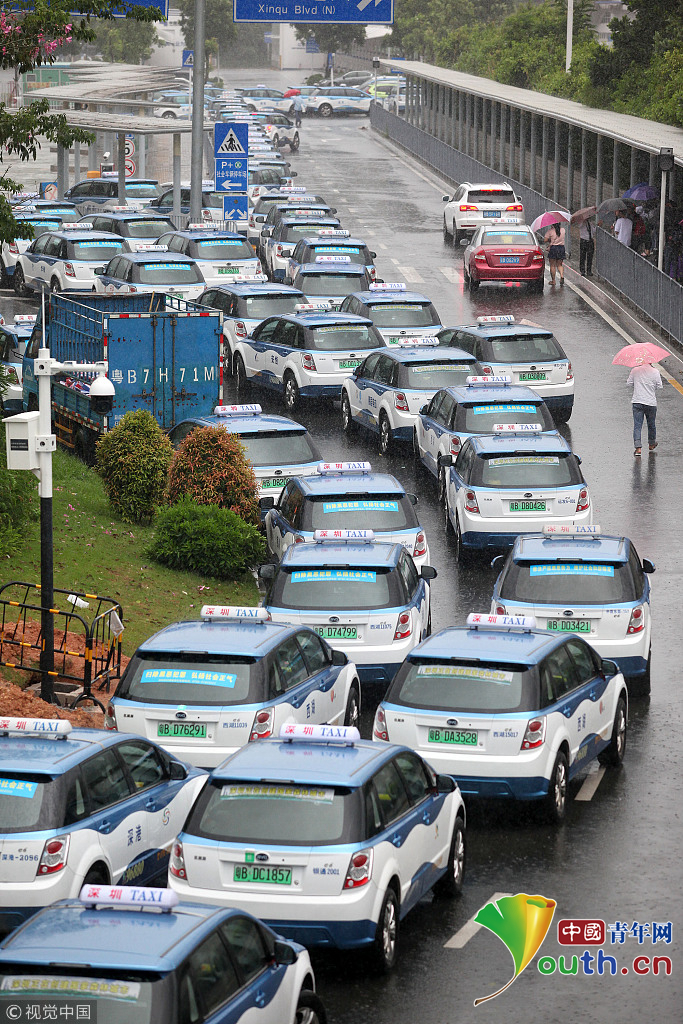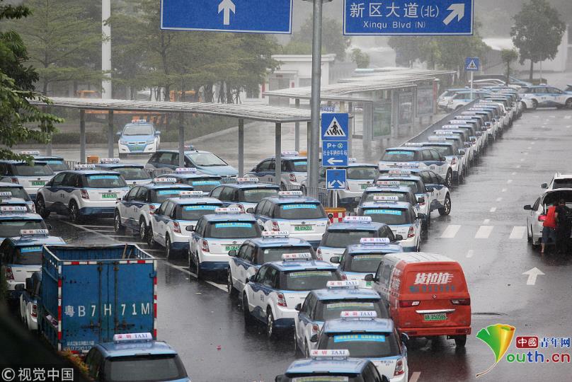 2018年9月16日,受臺(tái)風(fēng)山竹影響,全市的電動(dòng)車充電站暫停使用。深圳市民樂P+R停車場(chǎng)外,停滿了等待充電站開門的電動(dòng)出租車。