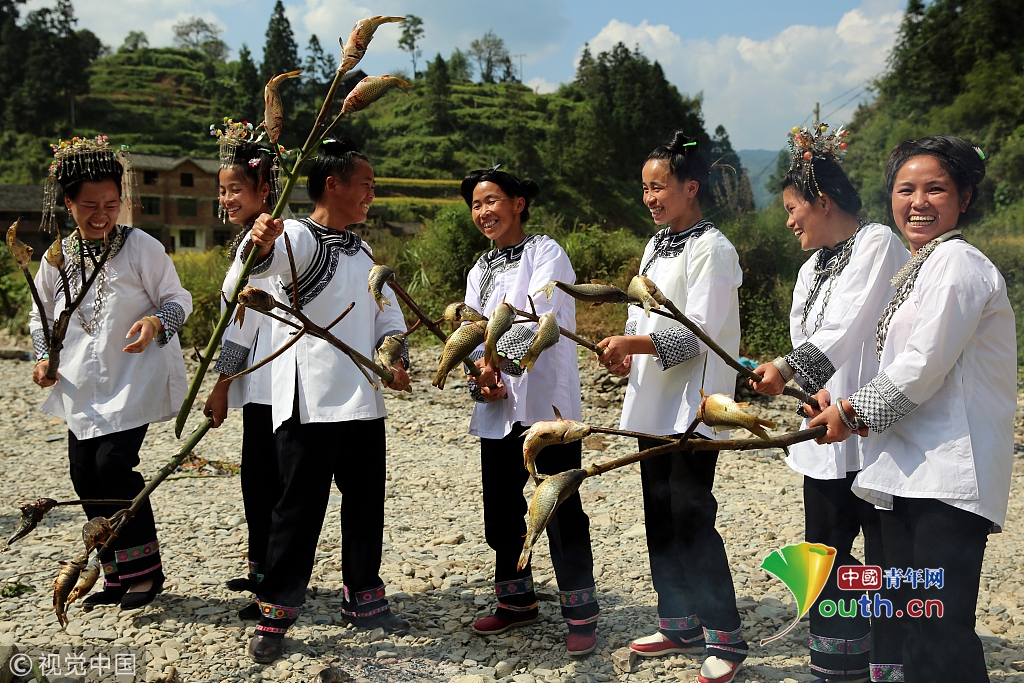 2016年9月17日,貴州省榕江縣平陽鄉(xiāng)硐里村七位侗家婦女們正燒魚。每年中秋時節(jié),當?shù)囟弊逋_田放水,捉魚,全寨男女老少,野外生起篝火烤魚,用烤魚、米酒等,祭祀魚神,祈禱魚糧豐收的傳統(tǒng)民俗活動。