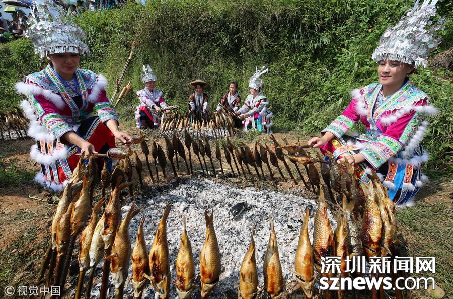 2016年9月17日,貴州省榕江縣平陽鄉(xiāng)硐里村七位侗家婦女們正燒魚。每年中秋時節(jié),當?shù)囟弊逋_田放水,捉魚,全寨男女老少,野外生起篝火烤魚,用烤魚、米酒等,祭祀魚神,祈禱魚糧豐收的傳統(tǒng)民俗活動。